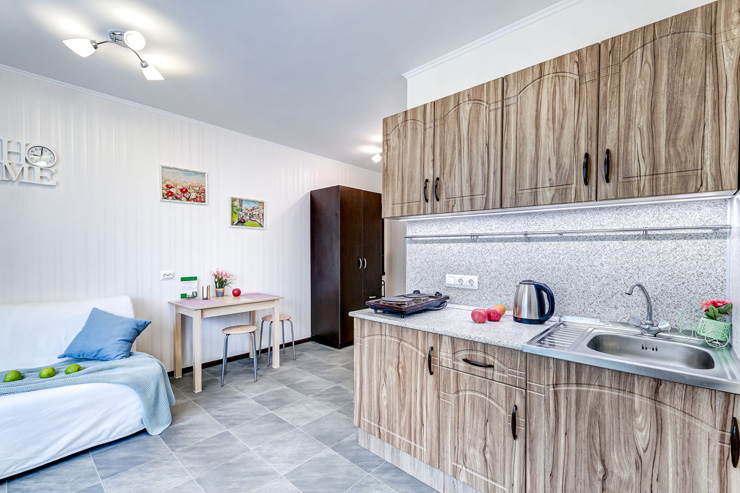 | Апартаменты 1-комнатные (ванна) | 30 кв.м. | 2 чел. | Кухня, Мебель (кровать двуспальная, стол, стулья, шкаф), Оборудование (духовой шкаф, микроволновая п... | |